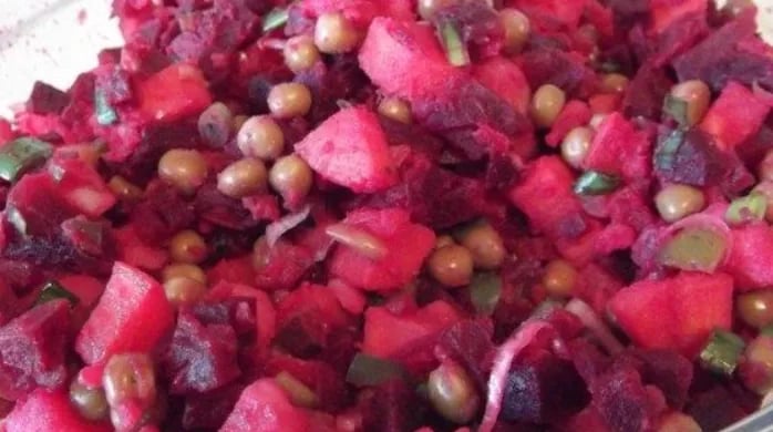 Drain water. Wipe peels off beets, and peel potatoes.